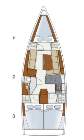 Her hull, sail plan and underwater appendices are based on the latest design programs and an outstanding knowledge of offshore racing and cruising yacht design. The interior offers a double aft cabin version (optional), a large head with shower, a spacious and seaworthy galley as well as a forward cabin with large lockers. The saloon sofa is easily convertible into a double berth.